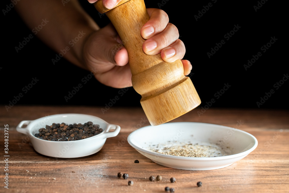 Granos de pimienta negra recién molida y granos enteros de pimienta negra en una plato de ceramica blanca #340823725