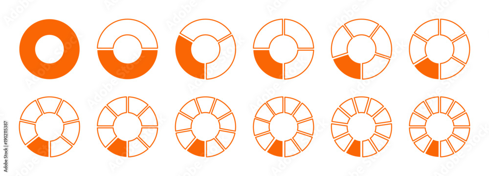 Graph icon pie, pizza shape orange section charts. Circles orange-white diagram divided to 12 equal parts. Orange coaching blank template. Set of segments wheel round divide infographic. #1902115387