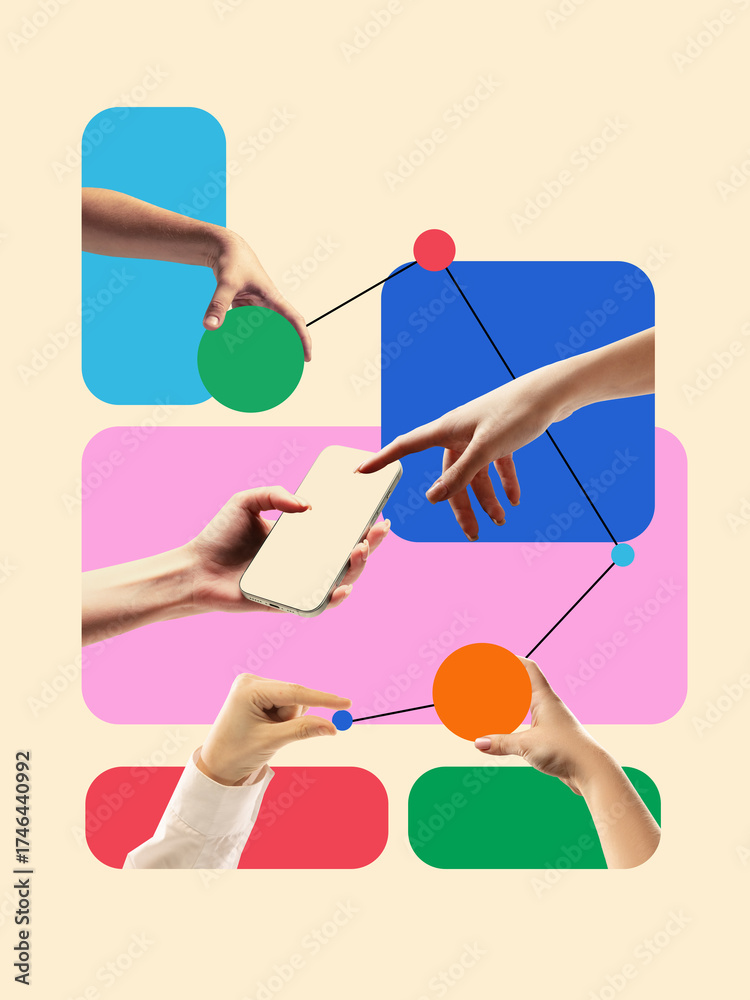 Graphic composition. Hands holding smartphone and colorful geometric shapes. Concept of teamwork, communication, and creative UX design for web marketing, apps, and modern branding. #1746440992