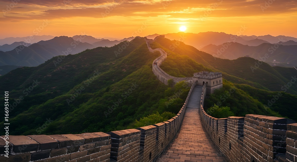 Great wall of china stretches across mountainous terrain during vibrant sunset, showcasing ancient architecture and natural beauty in serene atmosphere. #1669514101