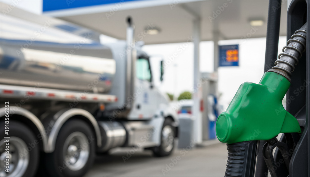 Green fuel pump nozzle at a gas station with a fuel tanker truck in the background #1918566252