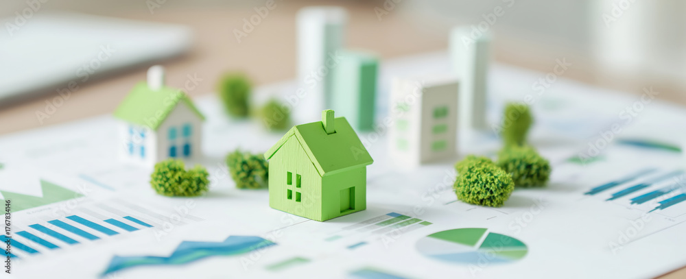 Green miniature 3d houses on financial charts. Concept of eco-friendly real estate investment, sustainable construction and home renovation project #1767834146