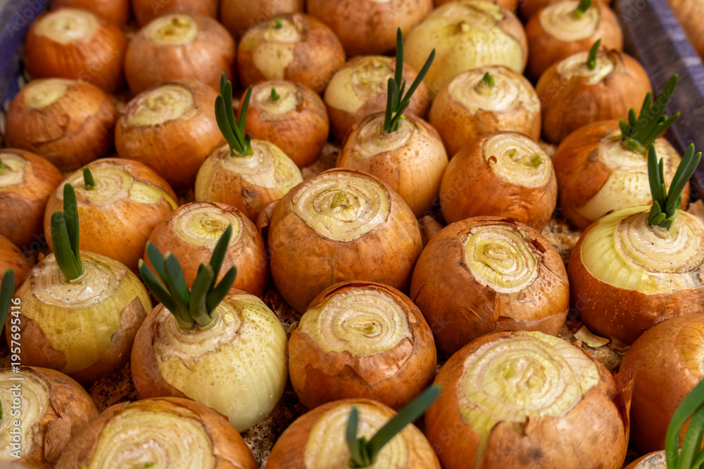 Green onions are growing in a greenhouse setting, showing new shoots and healthy bulbs, showcasing an active gardening process #1957695416