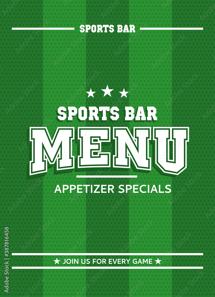 Green sports bar menu. Can be used for soccer and american football style. Retro, grunge, vintage style. Vector illustrator. Template with striped background. #387816458