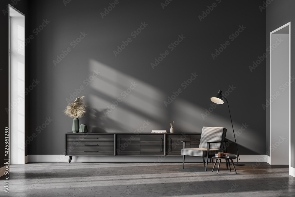 Grey living room interior with armchair, drawer and lamp, mockup #425361290