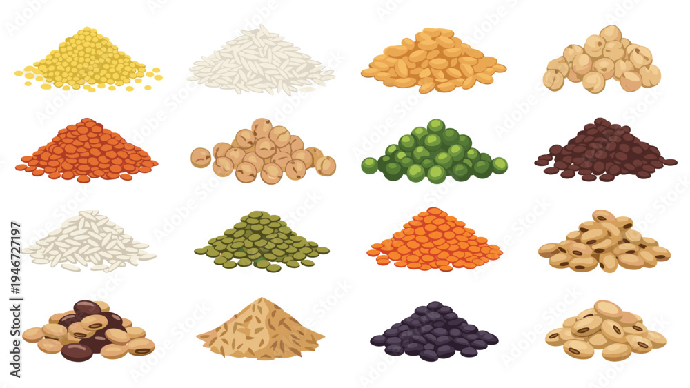 Grid of various colorful grain and legume piles including rice lentils beans and peas for healthy food information. #1946727197