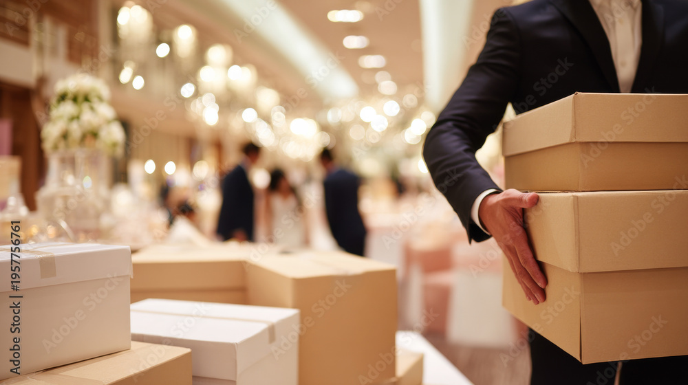 Groom organizing cardboard boxes with wedding supplies, medium close-up, modern reception hall interior, warm overhead lighting, bride and coordinators visible in background blur, clean professional #1957756761