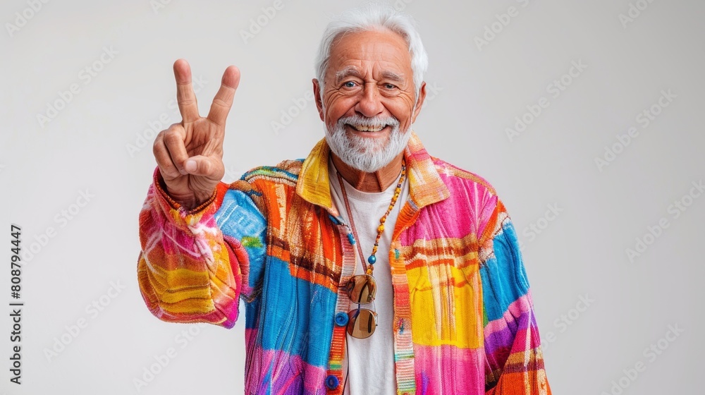 Groovy grandpa in a colorful sweater flashes a peace sign. #808794447
