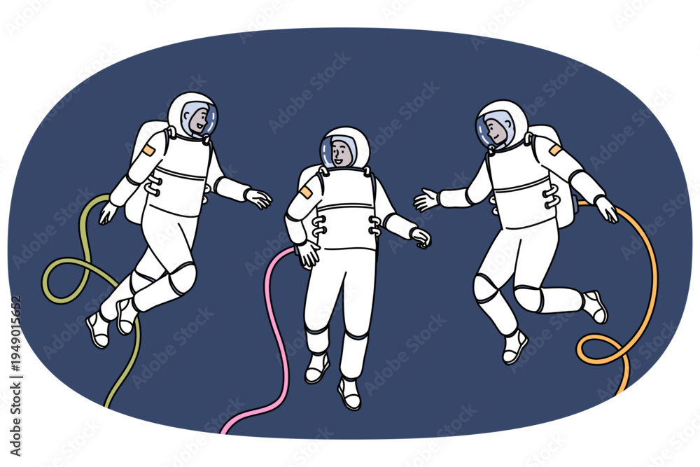 Group of astronauts participating in space research mission floats in zero gravity, dressed in spacesuits. Teamwork of astronauts going on scientific expedition in orbit of planet or in galaxy #1949015652