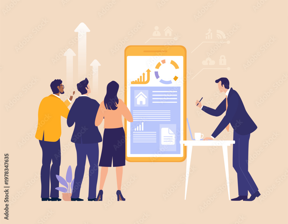 Group of business professionals analyzing charts and graphs, symbolizing data analysis, strategic planning, financial review, teamwork, and informed decision making in a corporate environment. #1978347635