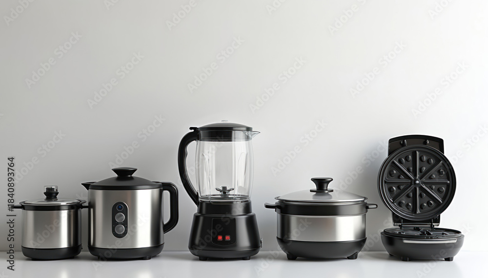 Group of modern kitchen appliances including blender pot electric kettle rice cooker and waffle maker. Small home gadgets for cooking and food preparation are arranged on table. #1840893764
