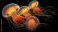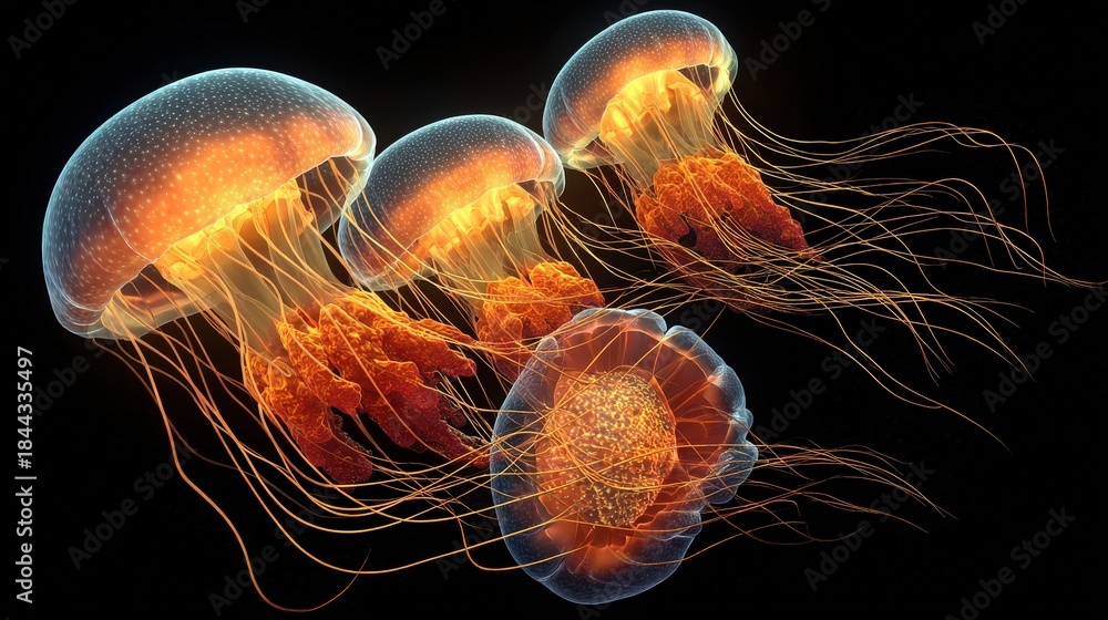 Group of translucent marine invertebrates illuminate against a deep black background #1844335497