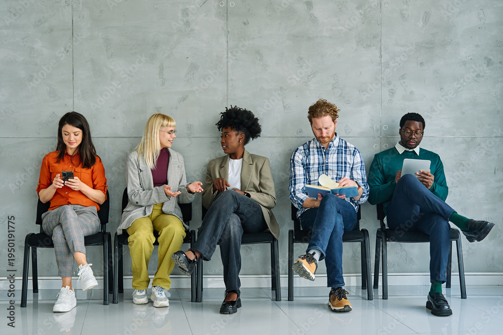 Group of young businss people sitting in chairs and waiting for an interview holding application documents #1950191775