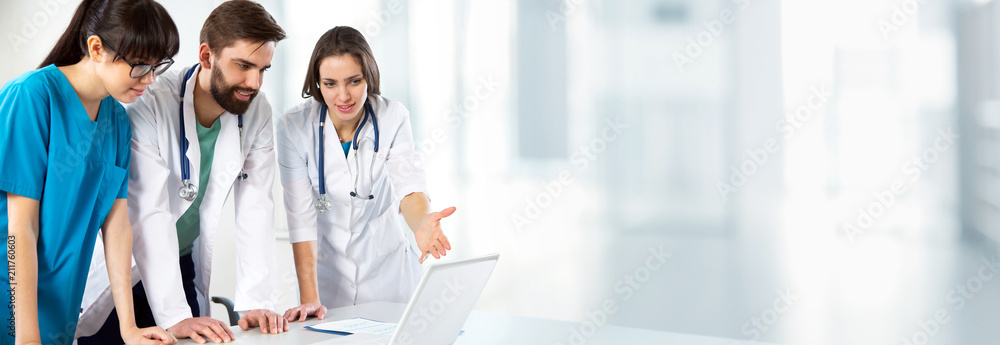 Group of young doctors working together on modern clinic background. #211760603