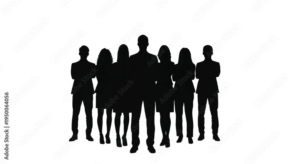 Group silhouette of diverse business professionals standing together with arms crossed against a stark white. #1950064056