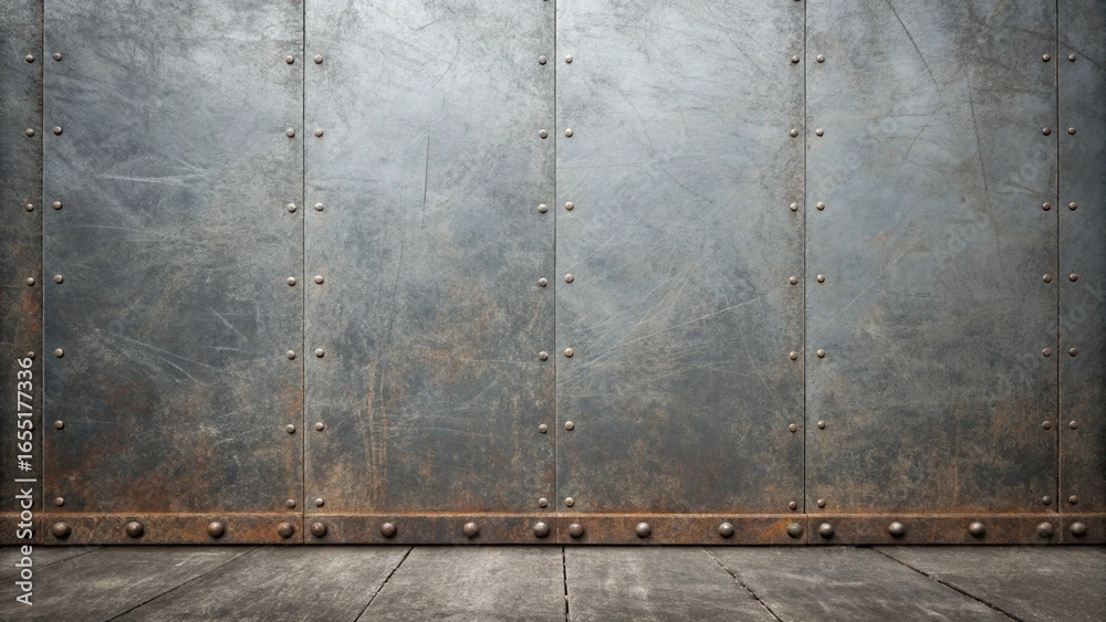 Grunge metal wall with rivets and wooden floor creates a vintage industrial background with a rough and aged texture for design #1655177336