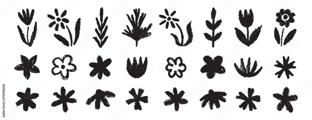 Grunge trendy doodle flowers leaves set. Hand drawn brush flowers crayon, chalk texture. Flowers textured collection #1761486206