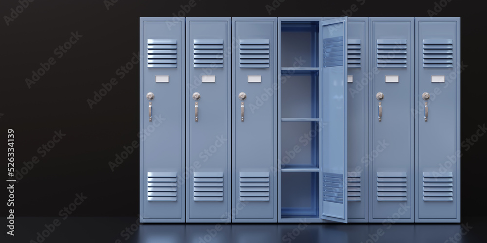 Gym locker, one open empty. School students storage closets on black floor #526334139