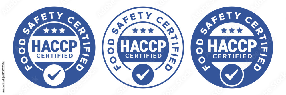 HACCP Hazard Analysis Critical Control Points, Food Safety system, logo, badge, icon, sticker, label, emblem, stamp, symbol, sign, circle, blue, flat vector, isolated illustration. HACCP Certified. #1953379986