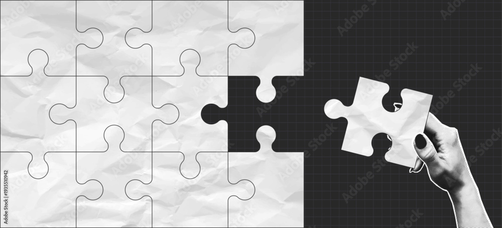 Halftone hand connects missing piece of jigsaw puzzle. Collage design with incomplete jigsaw puzzle and hand that connects missing part. Vector. #1935510942