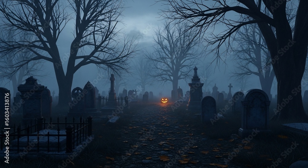 Halloween graveyard spooky cemetery pumpkin scary night dark halloween scene creepy october fog graves #1603413876