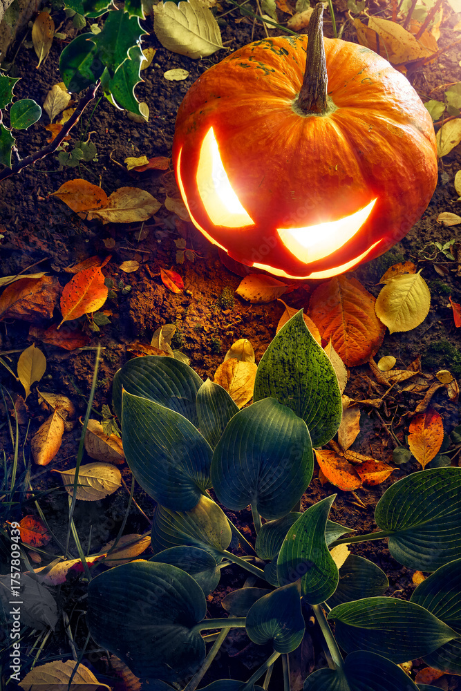 Halloween holiday decoration. Jack-o-lantern glowing Pumpkin head with scary smiling face among autumn fall leaves. Happy scary pumpkin close-up. #1757809439