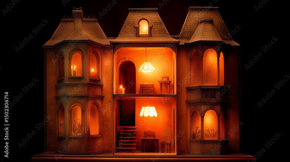 Halloween miniature dollhouse with flickering lights in a spooky Victorian setting #1502306714