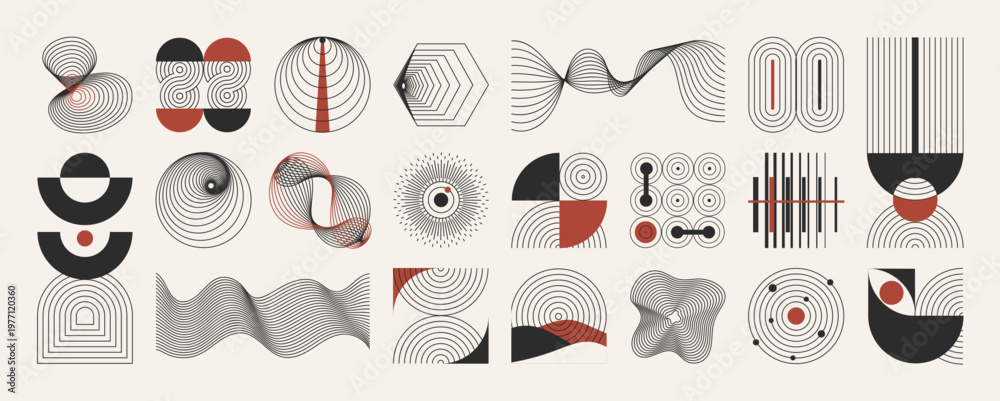 Hand drawn abstract minimal element mid century vector set. Aesthetic contemporary stripe line art, geometric shape in monochrome. Art form design for wall art, decoration, wallpaper. #1977120360