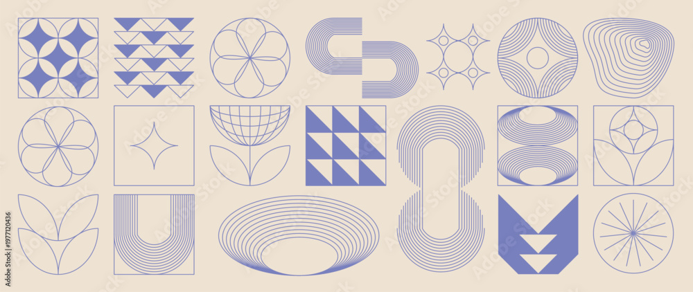 Hand drawn abstract minimal element mid century vector set. Aesthetic contemporary stripe line art, geometric shape in monochrome. Art form design for wall art, decoration, wallpaper. #1977120436