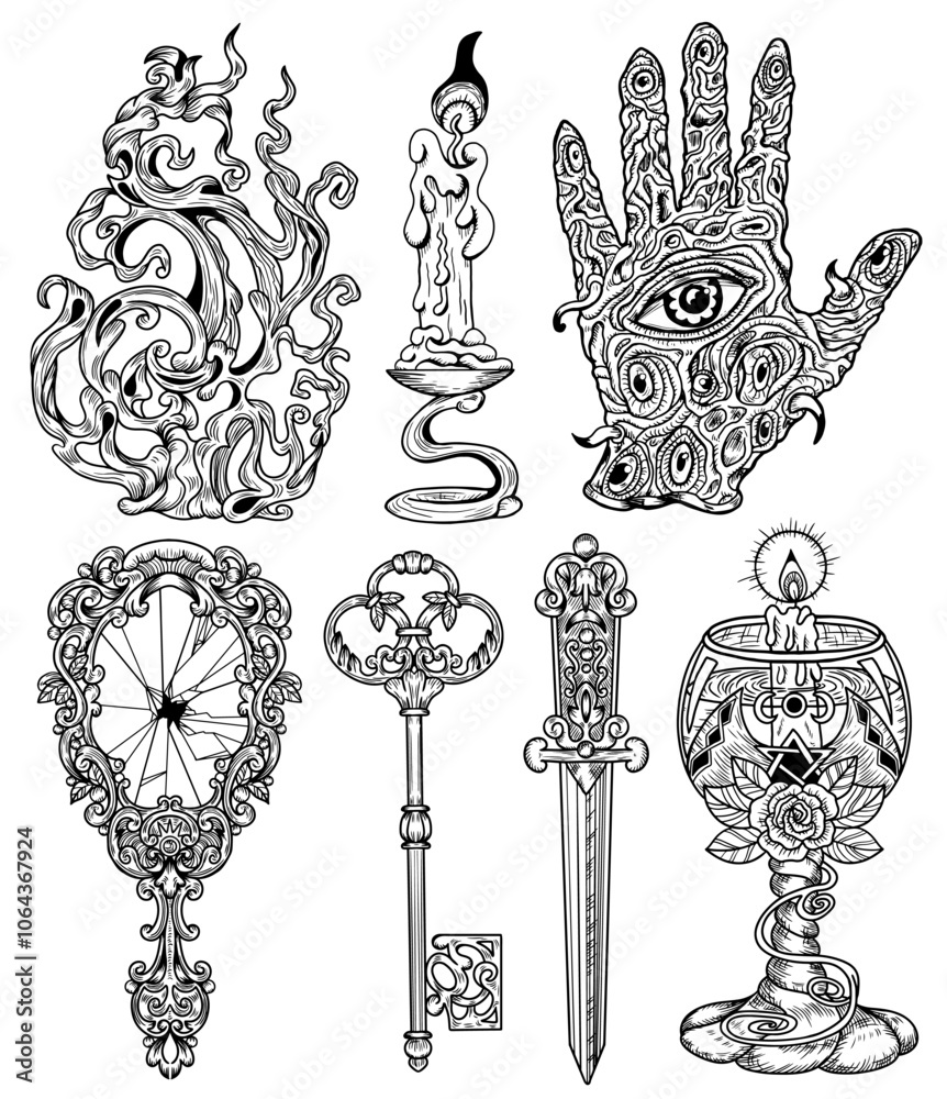 Hand drawn design set with engraved mystic and gothic objects - mirror, key, candle, cup, scary hand, sword. Hand drawn vector graphic illustrations for Halloween with esoteric and occult symbols #1064367924