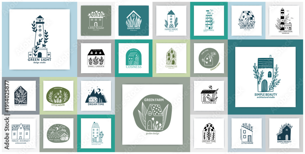 Hand drawn home logo. Lighthouse and cottage building. Green farm. Cozy house with tree leaves. Plant twigs. Real estate. Simple architecture doodle flat sketch. Vector square cards set #1914025877