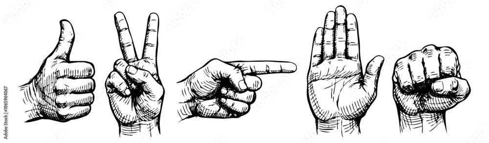 Hand drawn line art hand gesture icons set featuring thumbs up, peace sign, pointing finger, open palm, and a clenched fist for communication and graphic design #1865964067