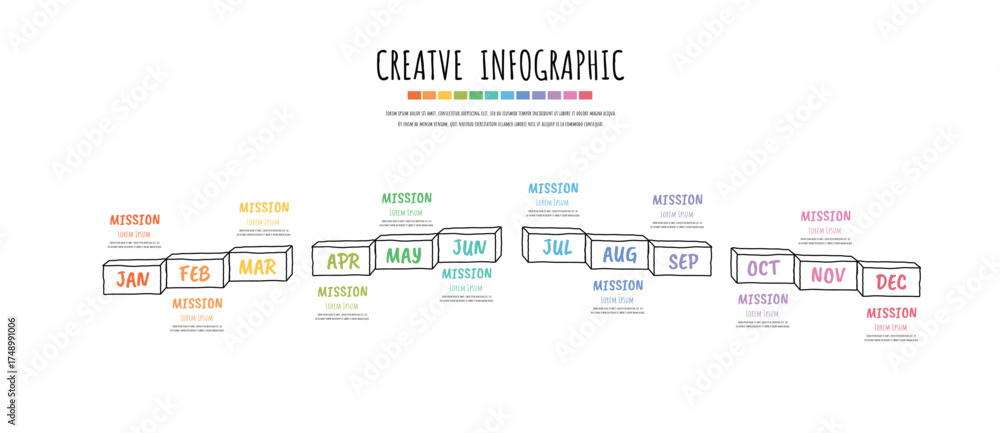 Hand drawn line process 12 months flow chart, Hand drawn presentation, Year planner, 1 year. #1748991006