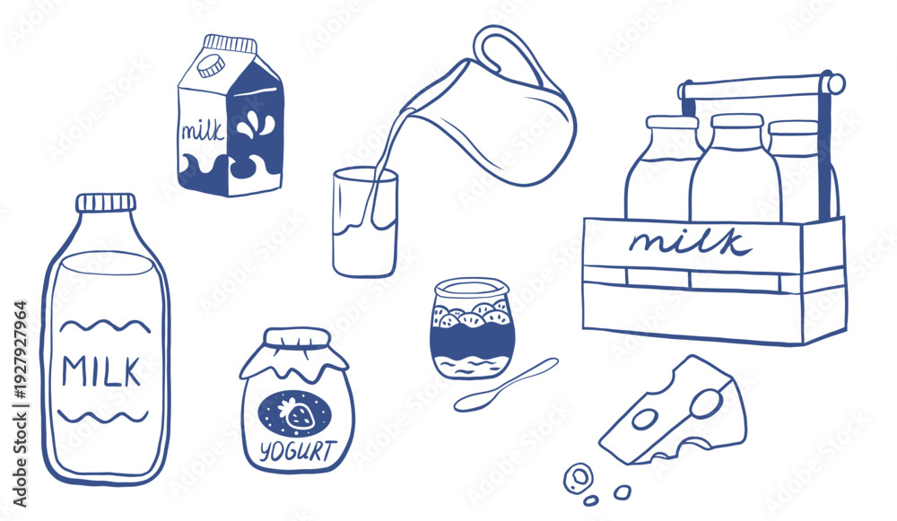 Hand drawn milk doodle sketch set. Milk, yogurt, cheese menu icon collection. #1927927964