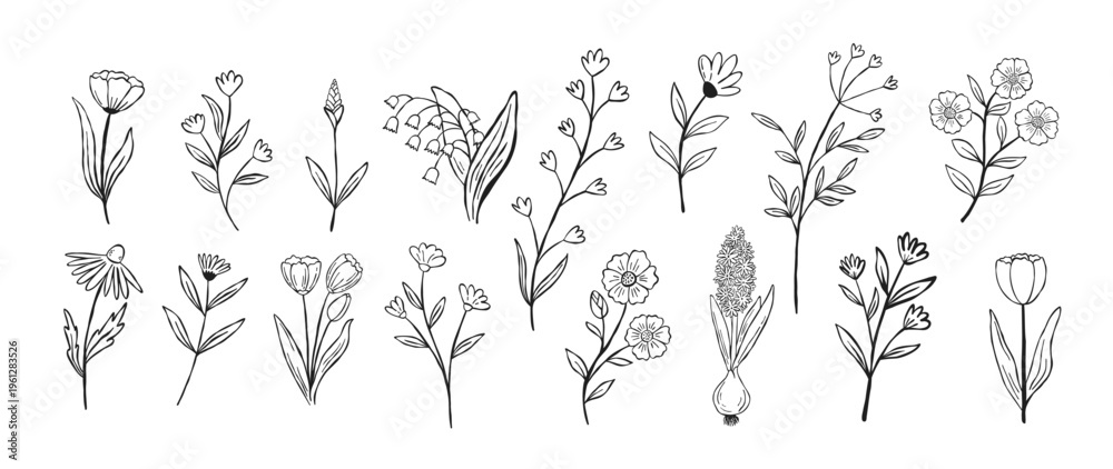 Hand drawn set of sinmple wildflowers and meadow plants. Botanical doodle vector illustration #1961283526