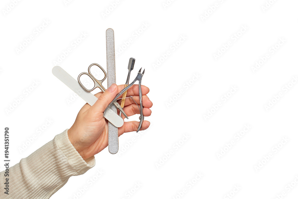 Hand holding a variety of nail care instruments for beauty and grooming #1941351790