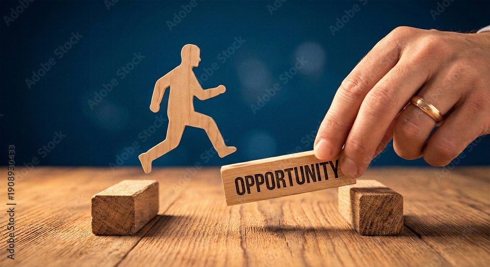 Hand placing wooden block with opportunity text for jumping figure to cross gap representing business success and career challenge solution #1908930433