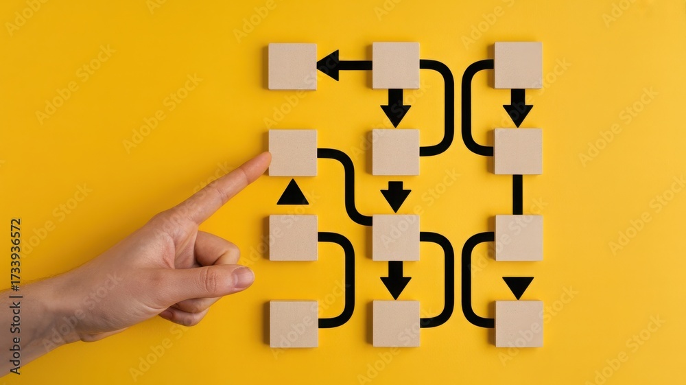 Hand pointing to flowchart process business strategy and workflow diagram on yell #1733936572
