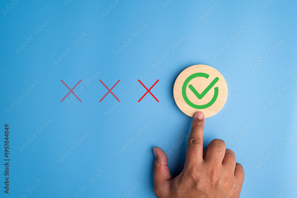 Hand selecting green check mark among red cross icons on blue background, representing customer satisfaction, quality approval, decision making, evaluation process and positive feedback selection #1957844849