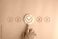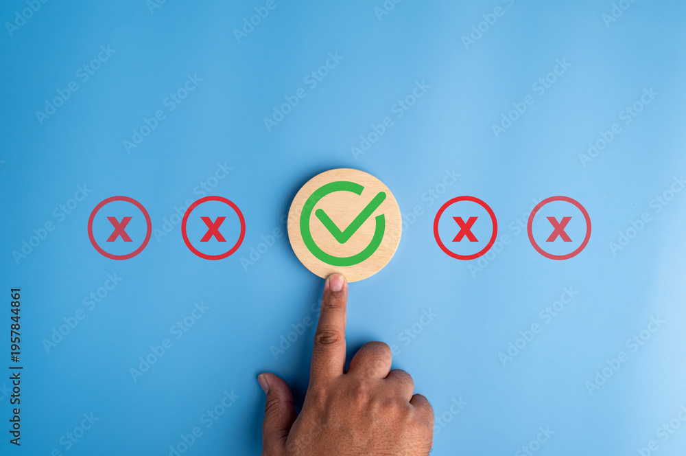 Hand selecting green check mark among red cross icons on blue background, representing customer satisfaction, quality approval, decision making, evaluation process and positive feedback selection #1957844861