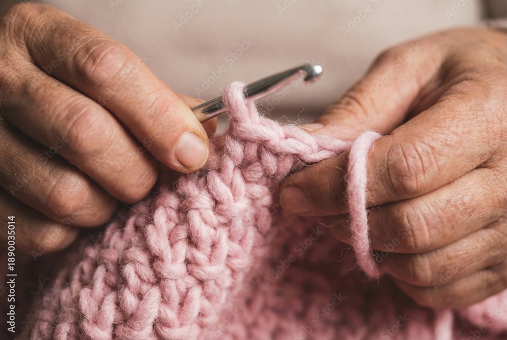 Hands focus on a pink yarn project with a crochet hook. The person is engaged in creating a handmade item. This activity occurs indoors during daytime hours #1890035014