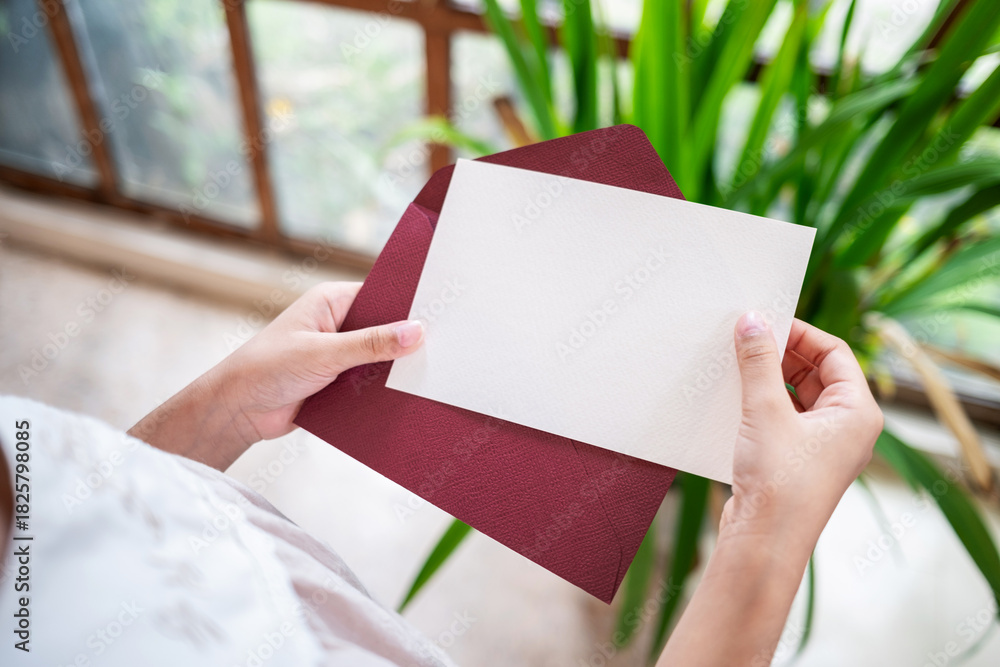 Hands holding blank white card with red envelope for invitation or greeting concept. Ideal for creative design projects and mockups or print templates. #1825798085