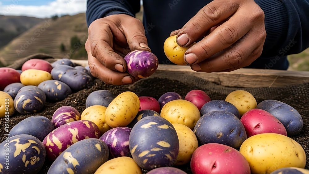 Hands holding colorful Andean potatoes in a rustic setting. #1916584053
