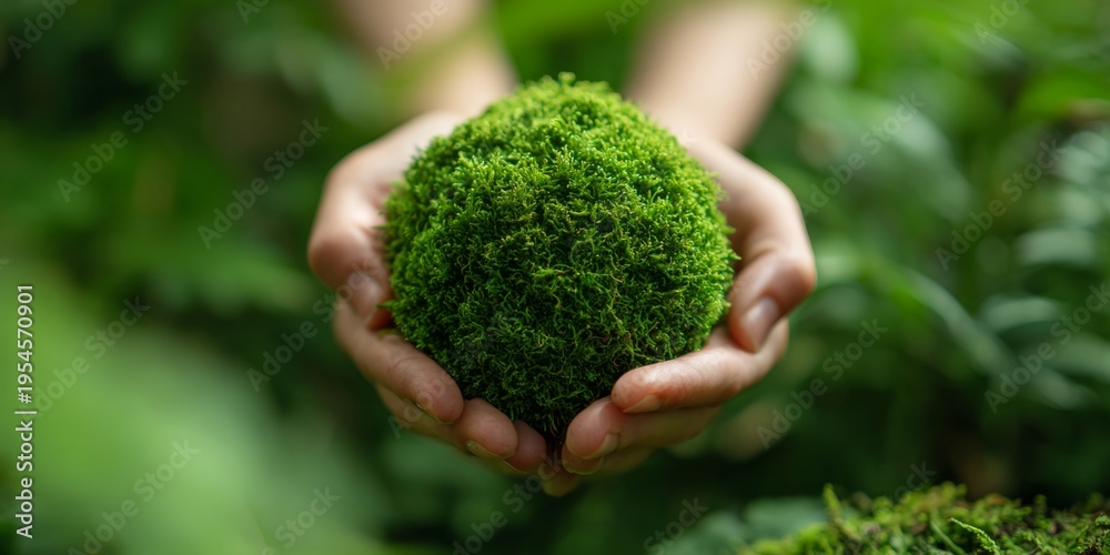Hands Holding Lush Green Moss Sphere Surrounded by Nature in a Vibrant Forest Setting Displaying Eco-Friendly and Sustainable Practices #1954570901