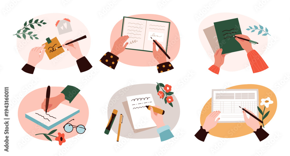 Hands writing on paper. Hand making notes in notebook, diary or sign document, top view. Card writing with pens and stationery, planning and communication. Vector isolated illustration #1943160011