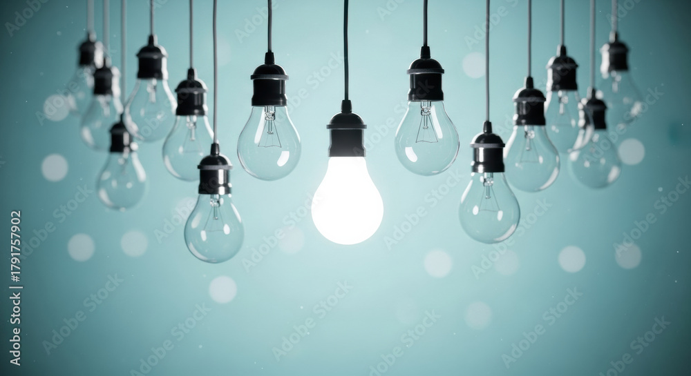Hanging light bulb glowing bulb innovation creativity idea inspiration blue background energy electricity modern minimal #1791757902