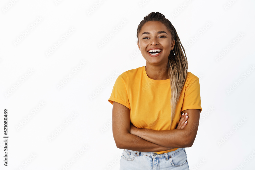 Happiness and people. Laughing Black woman smiling and looking carefree, joyful chuckle over smth funny, standing over white background #521080469