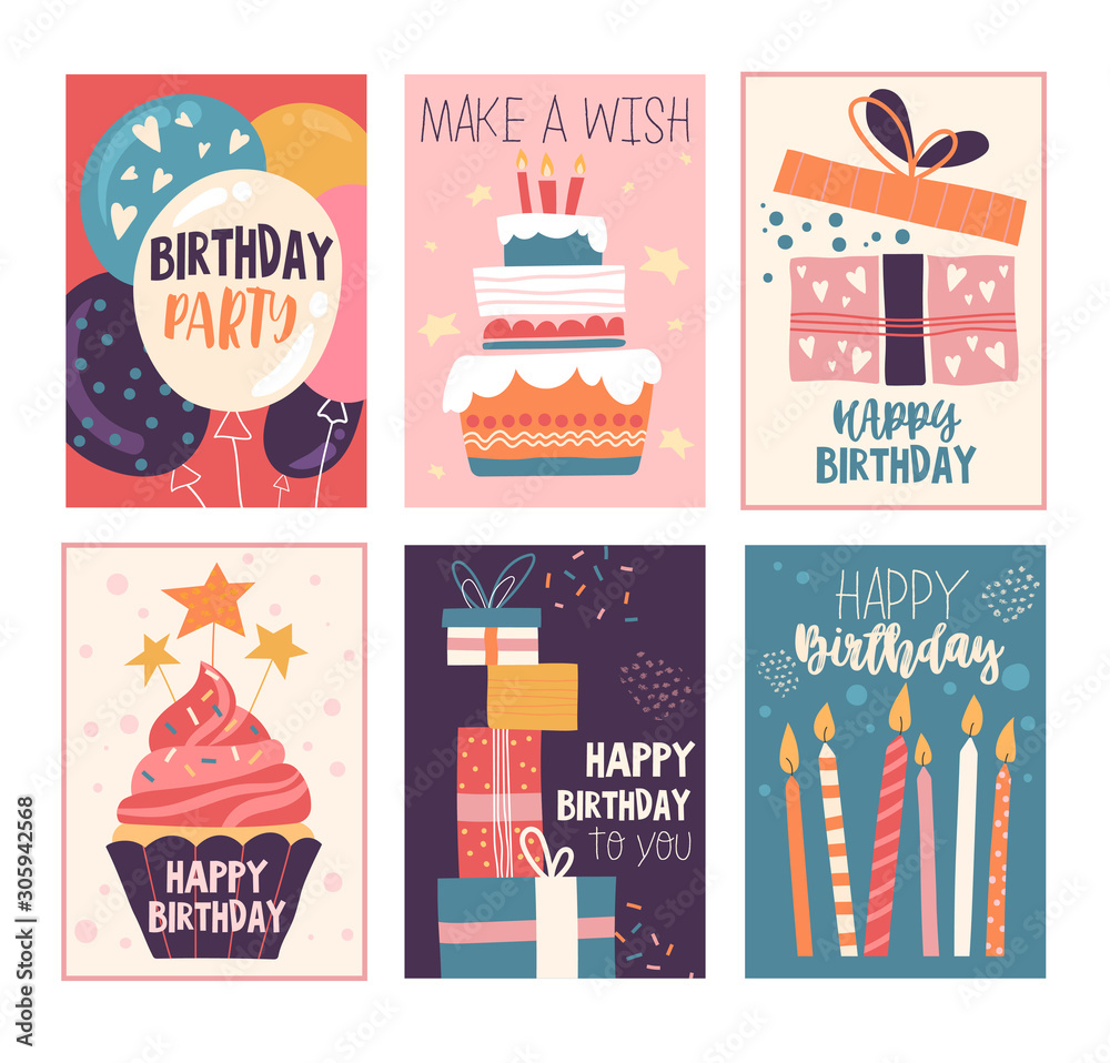 Happy birthday greeting card and party invitation set, vector illustration, hand drawn style. #305942568