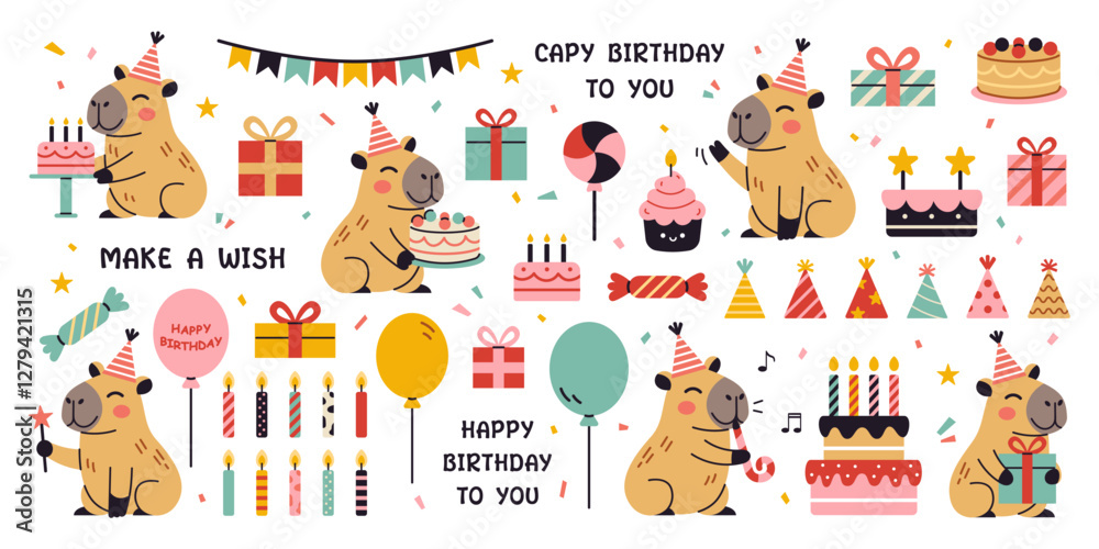 Happy birthday party set with cute capybaras and other elements. Vector childish collection of funny amusing capybara characters, birthday cakes and sweets, candles, balloons, party hats and gifts. #1279421315