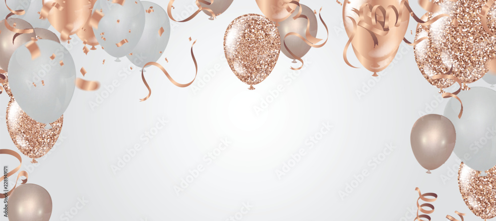 Happy birthday vector illustration. Confetti and ribbons gold orange balloon, confetti, design template for birthday celebration. art #228949171
